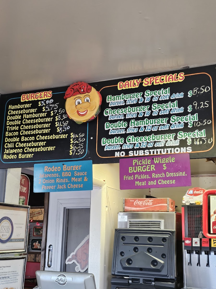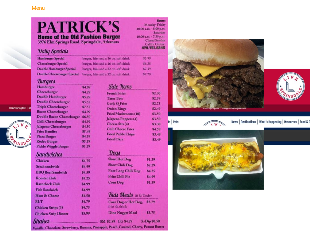 Introducing Patrick's Burgers, a hidden gem located at 3976 Elm Springs Rd in Springdale, Arkansas. This charming eatery offers a mouthwatering menu that beckons both burger enthusiasts and casual diners alike. The star of the show is their extensive selection of juicy burgers, ranging from classic options like the Hamburger ($4.09) and Cheeseburger ($4.29) to the indulgent Triple Cheeseburger ($7.55) and the unique Pickle Wiggle Burger ($5.29), featuring fried pickles and ranch dressing for a delightful twist.